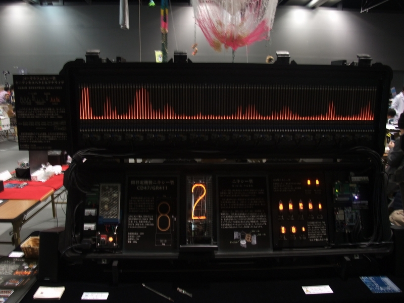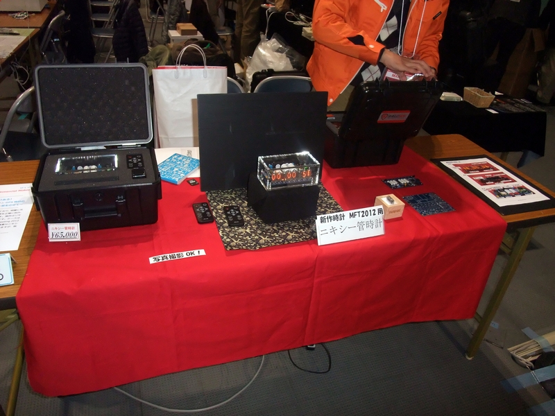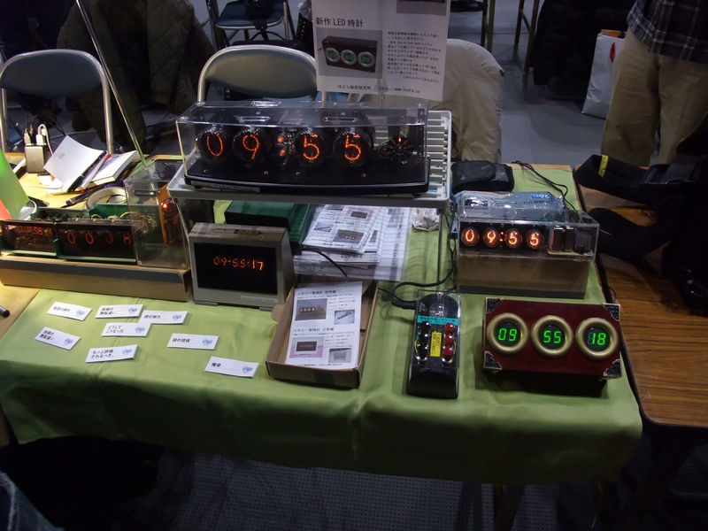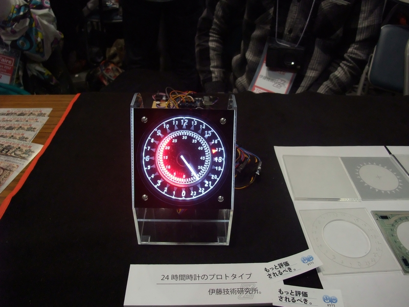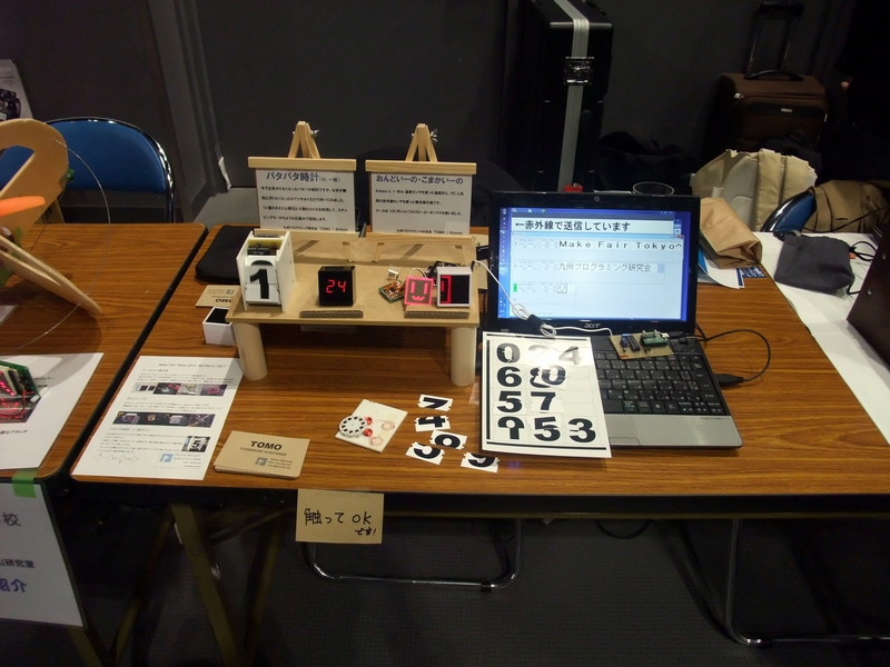 僕の展示、「パタパタ時計」。一昨年のMakeで1桁分作って燃え尽きてから、設計をやり直して何とか全桁揃えました。駆動用のコイル巻き、文字盤、基板、ケース加工すべて手作業です。もう作りたくない…。
